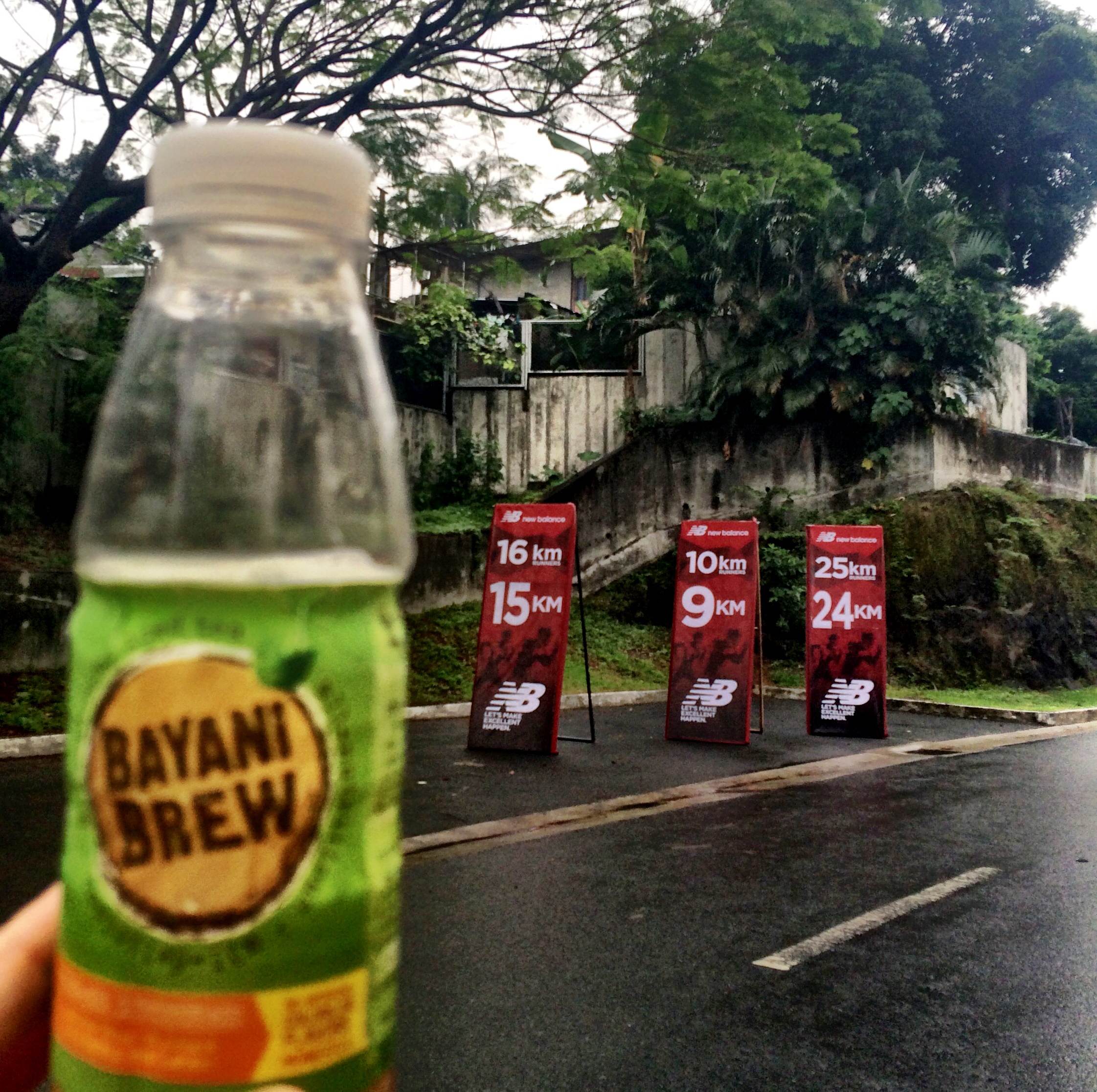 Breakfast on Race Day: I eat a full breakfast with mostly rice and fish. My trainer calls it “pagkaing mahirap” (food for the pauper). I also take a banana, hot choco and a couple of salt capsules, especially if I expect to run in warm weather. I also start drinking my race day hydration concoction composed of water, Gatorade, a couple of dissolved salt capsules and chia seeds. Sometimes I replace Gatorade with Bayani Brew, my favourite all-Filipino all-Natural iced tea. I usually bring a bottle of this special drink.